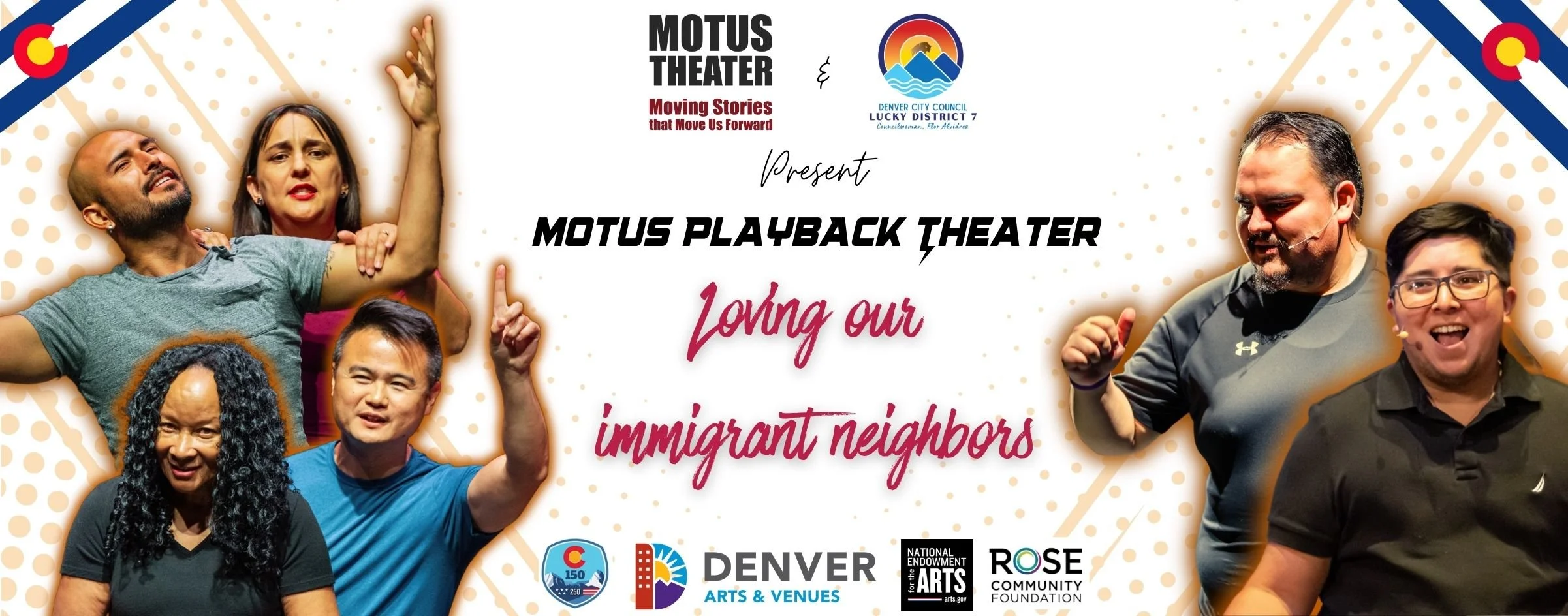 In honor of Colorado’s 150th Anniversary, Motus Theater & Denver District 7 present an interactive Playback Theater performance focused on Loving our Immigrant Neighbors. Audience members are invited to share personal stories of connection, solidarity, and belonging, which are then improvised live on stage by the Motus Playback Ensemble. Co-hosted by Denver City Councilwoman Flor Alvidrez, this event creates space for transformative listening and civic dialogue at a time when immigrant communities face harmful rhetoric and policies. Come witness how shared stories can move us forward together.