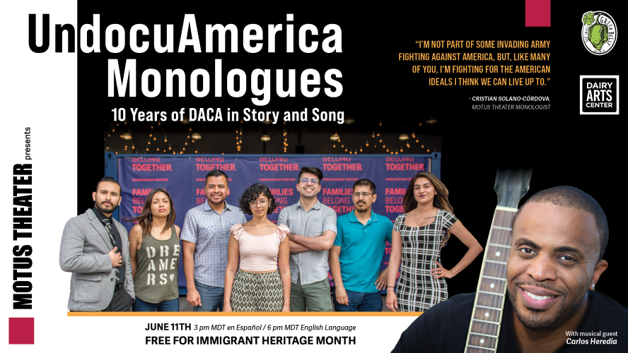 “UndocuAmerica Monologues: 10 Years of DACA in Story and Song” will be presented on stage in Boulder in both English & Spanish with musical responses by Carlos Heredia and visual art by Edica Pacha.
